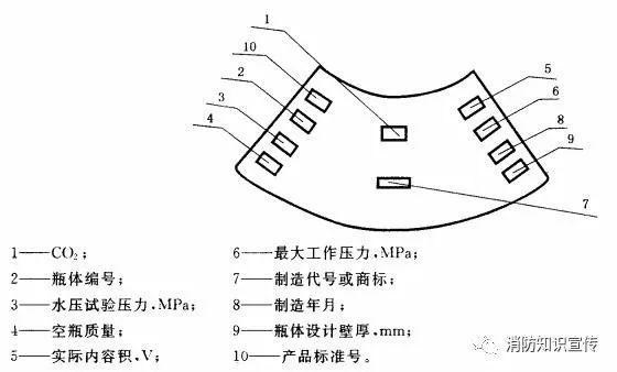 二氧化碳滅火器應在瓶體肩部打鋼印。鋼印應清晰、排列整齊。鋼印的字體高度為4 mm~10 mm;深度為0.3 mm~0.5 mm;鋼印的字體排列可呈扇面狀排列如圖3,也可在瓶肩部沿圓周線排列,各項目的排列應按圖3中指引號為序。鋼印標記應有下列內容:
