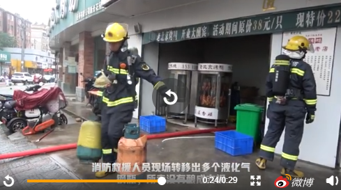 2020年7月,安徽淮南市田家庵區一間烤鴨店鋪發生火災,消防員到達現場后,店鋪內明火已被店員利用滅火器撲滅,消防員轉移出多個液化氣鋼瓶。據了解,因員工拎錯,將發電機用的汽油當成食用油倒進鍋里造成火災。