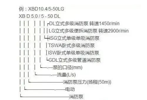 2、消防泵組型號由泵特征、泵組特征代號、主參數(shù)、用途特征代號、輔助特征代號及企業(yè)自定義代號等六個部分組成。其組成形式如下: