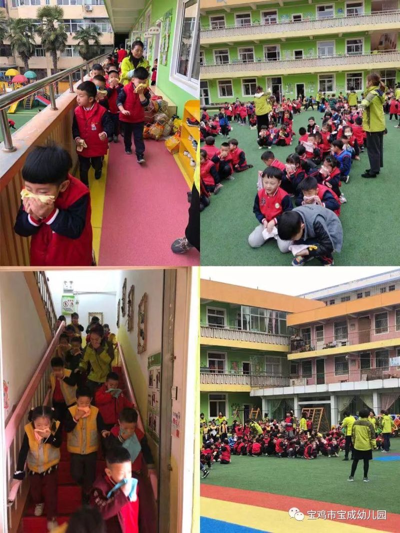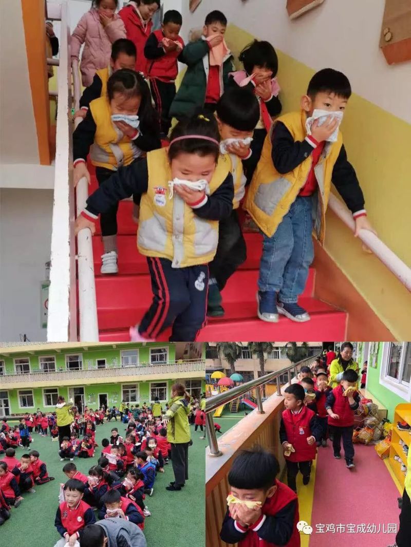 警鈴聲響起,各班教師按指定路線有序帶領幼兒用濕毛巾捂住口鼻,彎腰小步安全撤離到操場。