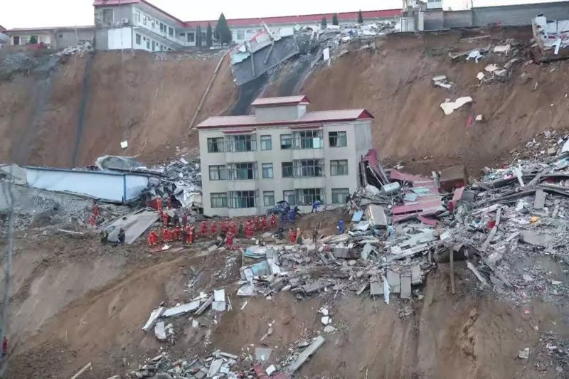 山體滑坡位置在棗嶺鄉(xiāng)的衛(wèi)生院后院,滑坡導(dǎo)致衛(wèi)生院一棟家屬樓和信用社一棟家屬樓、一座小型洗浴中心樓垮塌。在衛(wèi)生院緊靠的北側(cè)山溝內(nèi),一棟樓整體滑落至半山腰,另外兩棟樓垮塌散落溝坡,大部分被黃土掩埋。