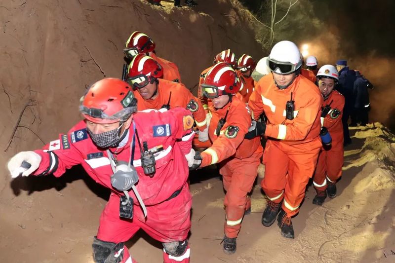 即使下去營救的路面也完全看不出任何人可以走的“路”,全都是很陡很立的土坡,看著平整的地面完全是假象。虛土之下不指導(dǎo)是碎石,還是深坑,加上夜間能見度低,大家基本上就是摸索著前進。