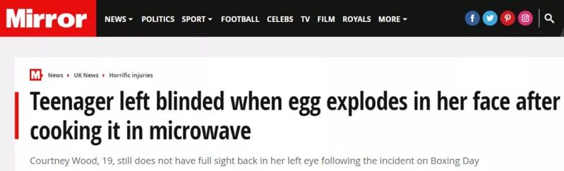 前不久就有一個(gè)英國(guó)女性因?yàn)橛梦⒉t加熱雞蛋,導(dǎo)致短暫性失明,到現(xiàn)在視力也還沒(méi)有恢復(fù)。