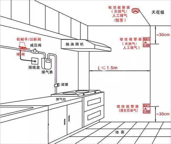 《家用和小型餐飲廚房用燃氣報警器及傳感器》GB/T 34004-2017針對小型餐飲廚房的環境特點和使用特點,要求必須有報警輸出功能,報警后或切斷燃氣通路或啟動通風措施。