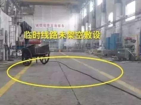 排查依據:《電氣安全管理規程》(機械工業部[86]機生字 76號)第20條 臨時線路必須采用絕緣良好的導線,應用電桿沿墻用合格瓷瓶固定架設,導線距地面的高度室內應不低于2.5m。