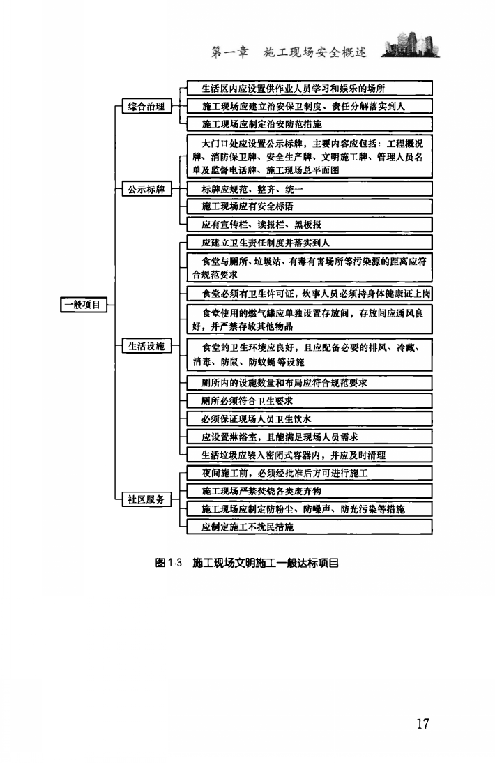 JGJ 59-2011《建筑施工安全檢查標(biāo)準(zhǔn)》對施工現(xiàn)場文明施工達標(biāo)項目包括保證項目(現(xiàn)場圍擋、封閉管理、施工場地、材料管理、現(xiàn)場辦公與住宿、現(xiàn)場防火)和一般項目(綜合治理、公示標(biāo)牌、生活設(shè)施、社區(qū)服務(wù))兩項內(nèi)容。其達標(biāo)要求見圖1-2和圖1-3.