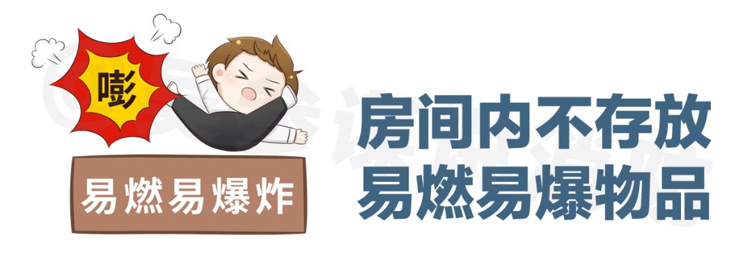 房間內不存放汽油、酒精等易燃易爆物品,不堆放易燃雜物,不躺在床上吸煙。