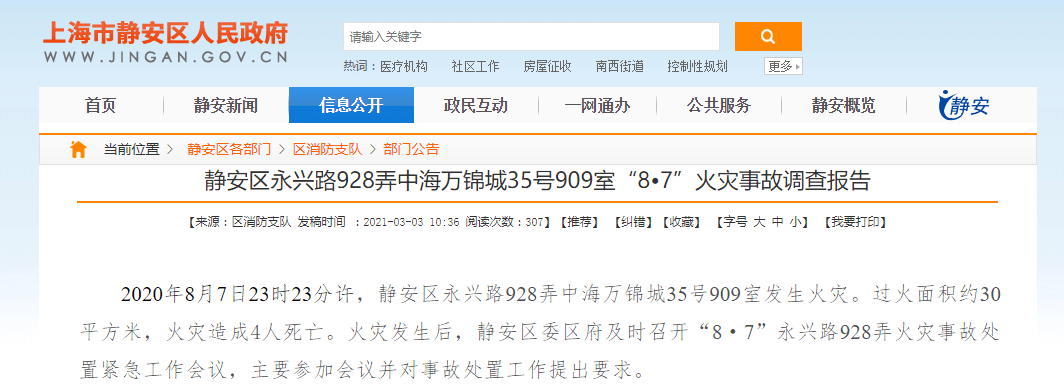 上海靜安區(qū)發(fā)生一起4人死亡的火災(zāi)