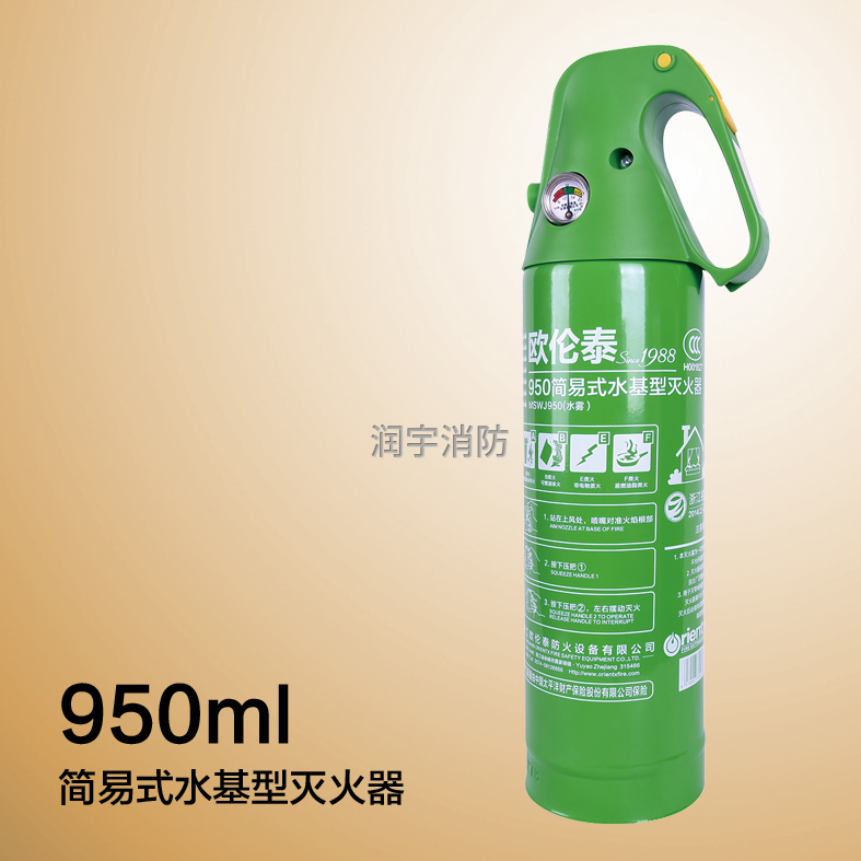 MSWJ950ml簡易式水基型滅火器特點是潔凈環保、滅火效率高、抗復燃性好、使用簡便、火場危機時刻可用于逃生自救等特點;缺點相對于干粉滅火器使用時間短,抗低溫性能差等。“歐倫泰”牌水基型滅火器筒體采用碳鋼材質,其滅火劑采用由歐倫泰公司自主研發的水系滅火劑,綠色環保、不會對周圍設備、空間造成污染;抗復燃性能強,滅火速度快,具有很強的滲透性,可滅深層次火災。可滅油脂類、電器類火。